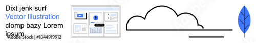 Data analysis, cloud computing, nature, eco-friendly technology, modern design, minimalism. Elements include a data dashboard, cloud outline and a blue leaf. Data analysis and cloud computing