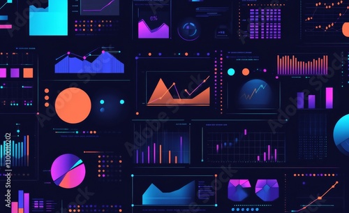Data analysis dashboard displays charts, graphs, & metrics on dark background for presentations