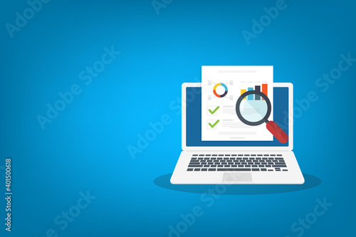 Data analysis, data report online on laptop computer, financial audit research analysis, analytics document web report, stats evaluation. Illustration