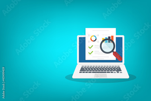 Data analysis, data report online on laptop computer, financial audit research analysis, analytics document web report, stats evaluation. Vector illustration