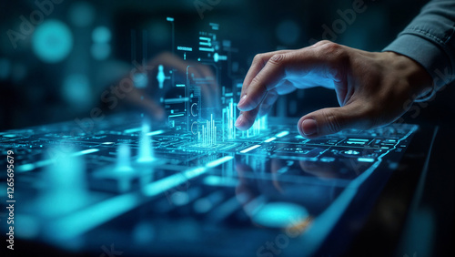 Data analysis interface. Futuristic data interaction. Hand interacting with digital screen. Advanced technology control panel.