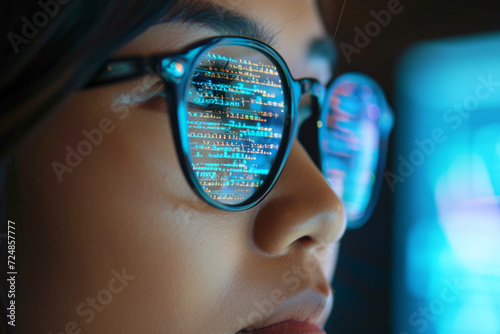 Data analysis with a woman in goggles, delving into complex coding and highlighting the digital framework, algorithm, and insight for innovative automation in a virtual environment.
