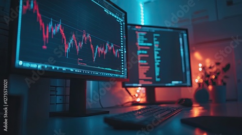 Data Analysis Workspace with Monitors Displaying Stock Charts