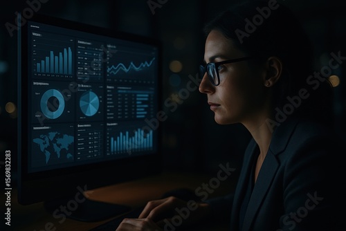 Data Analyst at Night: A focused female data analyst meticulously examines complex charts and graphs displayed on a large computer monitor in a dimly lit office.