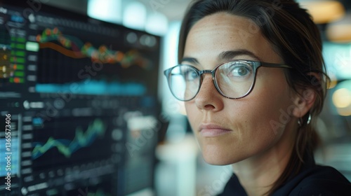 Data analyst focused on business intelligence and performance metrics in a modern office setting