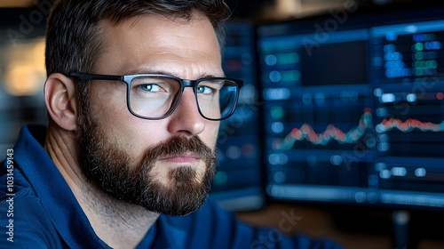 Data Analyst Reviewing Comprehensive Analytical Report with Graphs Charts and Tables Displayed on Dual Computer Monitors in Modern Office Setting