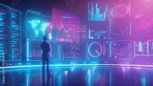 Data analytics and insights powered by big data and AI technologies. Data scientist analysing complex information with artificial intelligence for business analytics dashboard with charts and metrics