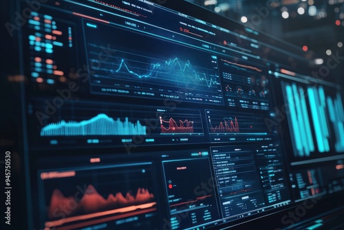 Data analytics automated with AI technology. Big data, business analytics and artificial intelligence automation. Dashboard report with sales and operations charts and KPI insights on touch screen, ai