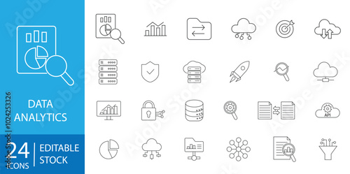 Data Analytics Icons set. database, statistics, server, monitoring, computing, network, big data, data processing, hosting.
