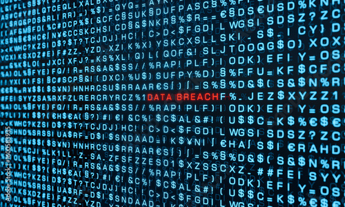 Data breach, computer warning sign. Random letters, signs, computer code, bits and bytes. System message, cyber attack, threat, network security, virus, computer crime. 3D illustration