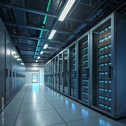 Data Center Server Room Long Corridor Composition, Illuminated Racks, Technology Concept, Data Storage, Network Infrastructure Data Center, Server Room