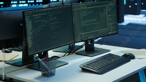 Data center workplace with networking systems installed used for managing infrastructure racks. Computer screens on desk in advanced server hub used for overseeing equipment