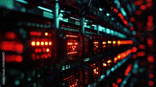 Data centers filled with rows and rows of servers as blinking light indicate constant processing