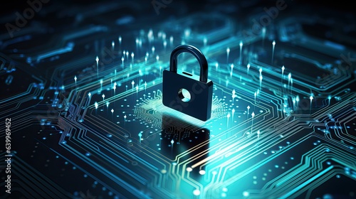 Data Encryption,Security Concept with Padlock on a Microchip.circuit board background.