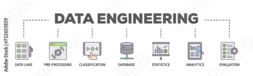 Data engineering banner web icon illustration concept with icon of data lake, pre processing, classification, database, statistics, analytics and evaluation icon live stroke and easy to edit