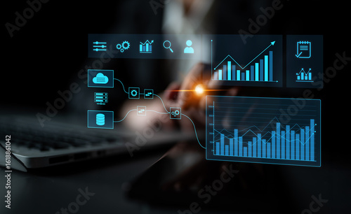 Data flow from database and cloud to processing and analytics dashboards, representing data analysis, automation, insight generation, and digital intelligence Latch