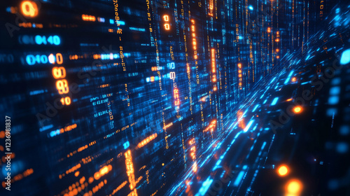 data highway concept visualization with binary program code and glowing fibres on dark background 3d render illustration