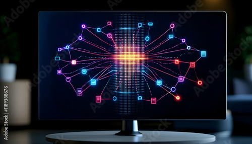 Data network visualization on computer screen, modern office background, illustrating digital connectivity and information flow, ideal for technology or business presentations