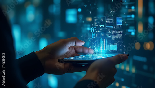 Data processing concepts are illustrated by a person holding a smartphone displaying an interface for data visualization and analysis._00002_