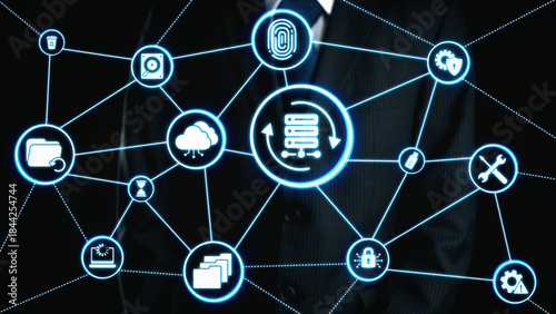 Data recovery icons show backup, data recovery process, and secure restoration. Data recovery ensures system reliability, data recovery protection, and information access. Gist