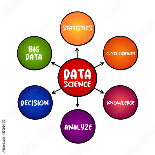 Data science - field that uses scientific methods, processes, algorithms and systems to extract knowledge and insights from structured and unstructured data, mind map concept background