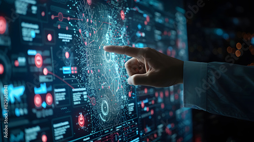 Data science and big data technology. Big data analytics visualizing complex data set on touchscreen. Data mining