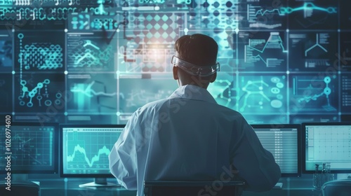 Data science and big data technology. Scientist computing, analysing and visualizing complex data set on computer. Data mining, artificial intelligence, machine learning, business analytics.