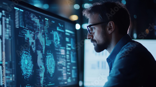 Data science and big data technology. Scientist computing, analyzing and visualizing complex data set on computer. Data mining, artificial intelligence, machine learning, business analytics.