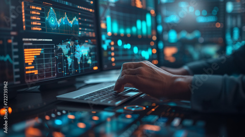 Data science, business intelligence. man using computer devices with internet global network technology and big data, cloud computing, AI software development, digital technology