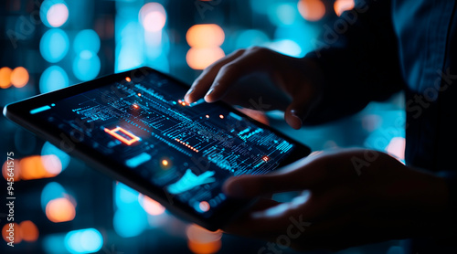 Data science, digital technology, big data management concept. Computer programmer, software engineer using digital tablet with internet network connection, software technology and development