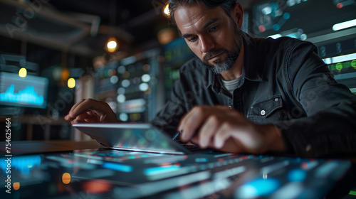 Data science. Man programmer using digital tablet computer analyzing and developing software on thefuturistic virtual interface screen. Algorithm, big data analysis and management, data visualization