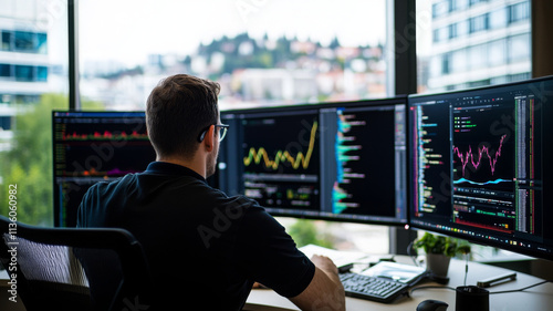 Data scientist analyzing trends on multiple screens in modern office