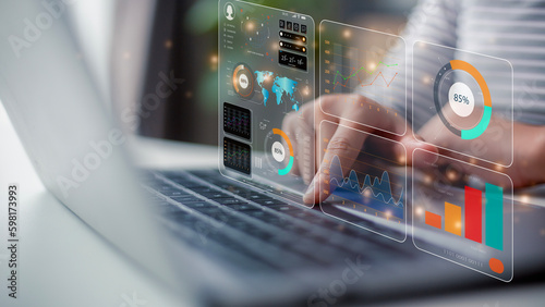 Data scientists. a programmer using a laptop to analyze and develop various information on a futuristic virtual interface screen. Algorithm. marketing and deep learning of artificial intelligence