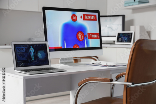 Data scientist's workplace with computer and laptop in laboratory