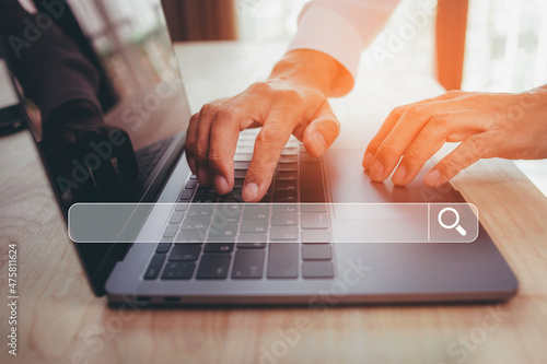 Data search technology search engine optimization with blank search bar, man hands working with laptop computer Searching internet data information.