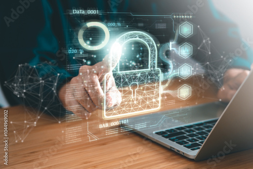Data Security system concept, Business man use laptop with security icon screen, innovation technology, cloud computing, internet network communication