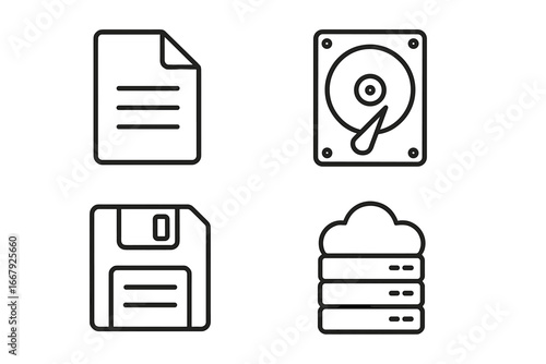 Data storage linear icon set. File, document, hard drive, floppy disk and cloud server outline symbols. Vector computer and technology concept for web, UI, UX design element.