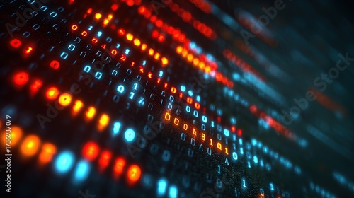 Data stream of glowing red and blue binary code on a dark background with shallow focus
