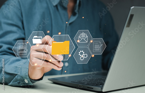 Data transfer backup, Folder document Management System DMS Open File folder with flying blank documents with computer. File Sharing, Document Transferring concept. searching and managing files.