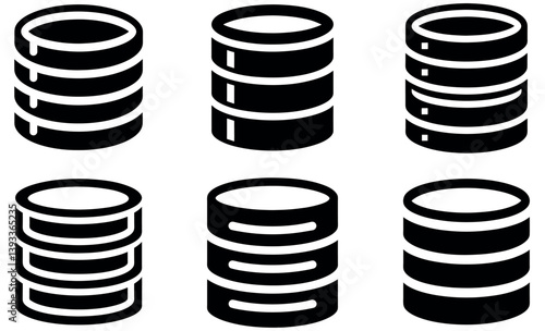Database Icon Silhouettes Set – Black Stack Symbols for Data, Server, and Tech Design