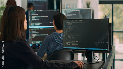Database programer writing source code on terminal window with html script, working on software development interface. Coder using programming language on database system server.