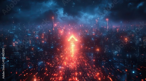 dazzling visual metaphor for digital transformation featuring an ascending arrow composed of glowing data points set against a backdrop of futuristic cityscapes and flowing streams of binary code