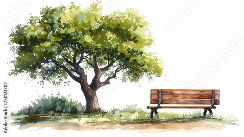 Deciduous Tree Oak and Bench Watercolor Illustration Generative AI