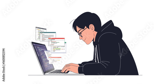 Dedicated developer focused on coding, working on a complex software program with multiple windows, showcasing his skill and dedication to coding