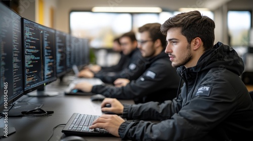 Dedicated programmers collaborating in a modern tech workspace during the day, immersed in lines of code on multiple screens