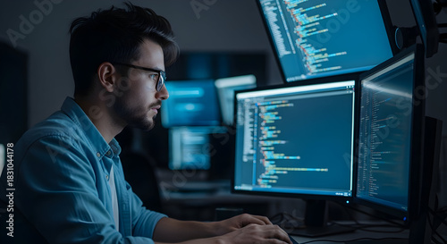Dedicated Software Engineer Crafting Code in Dark Room Cybersecurity Professional Focusing on Digital Security Solutions Working with Data Coding Application System