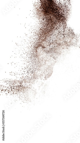 Deep brown powder dust explosion and falling down against white background.