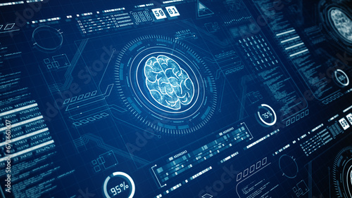Deep learning computer technology, HUD futuristic user interface of artificial intelligence concept with brain Icon, Futuristic technology innovation, Technology digital background. 3d Rendering