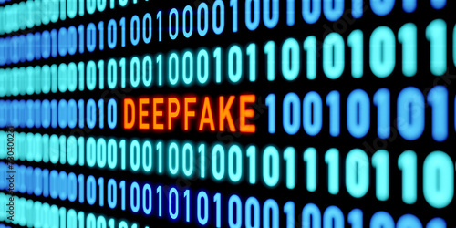 Deepfake message. Binary code, zero and one, deepfake in the system. Warning sign on screen. System message, cyber crime, hacking, threat, network security, computer virus.