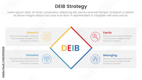 DEIB diversity strategy infographic 4 point stage template with rotate rectangle box with rectangle box diamond description for slide presentation